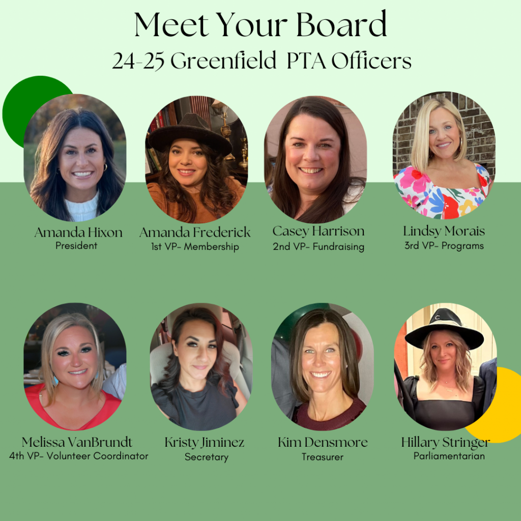 Our board is proud to serve our students and staff. Our parent and guardian volunteers are committed to the constant and consistent improvement of the school experience for our children and the Greenfield staff.